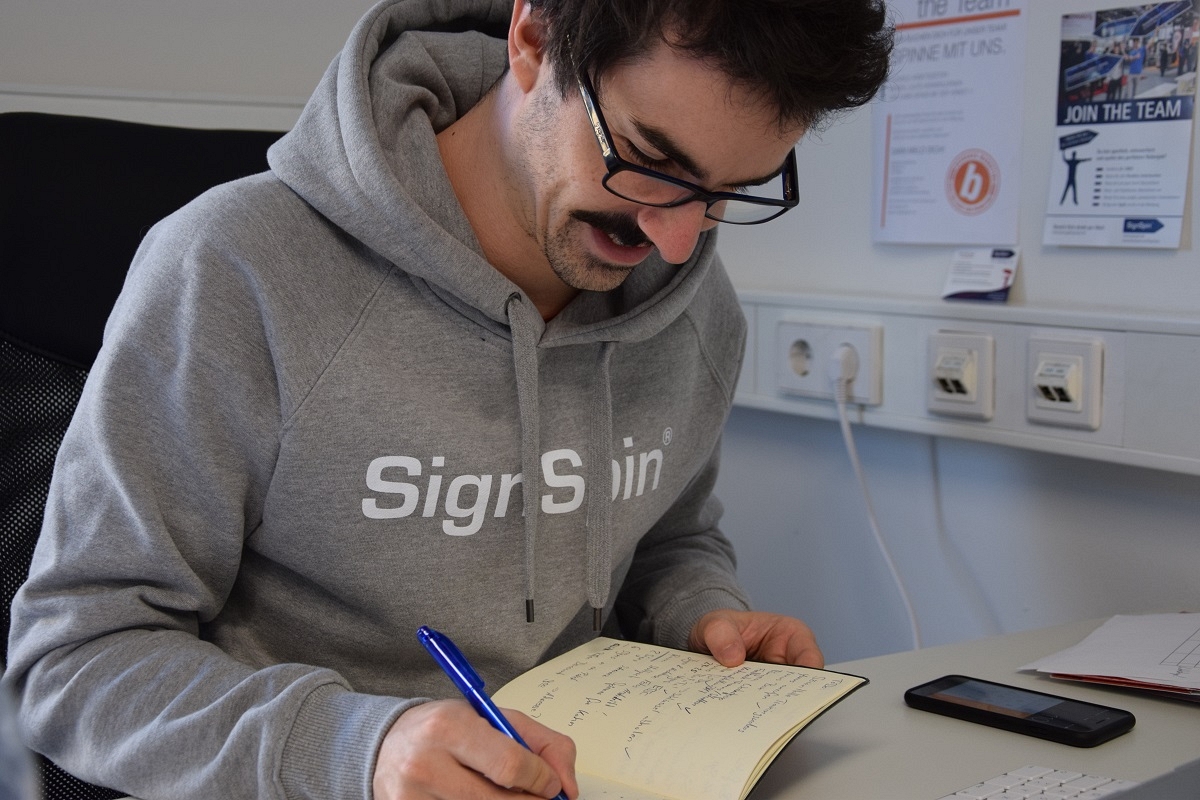 Das junge und moderne Team von SignSpin war auf der Suche nach fashionbewusster und qualitativer Firmenbekleidung. 0-8-15 Standardartikel kamen für sie nicht in Frage. Gemeinsam haben wir eine Kollektion erstellt, in der sich jeder Mitarbeiter wohl fühlt.